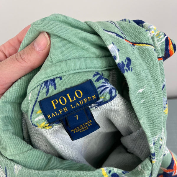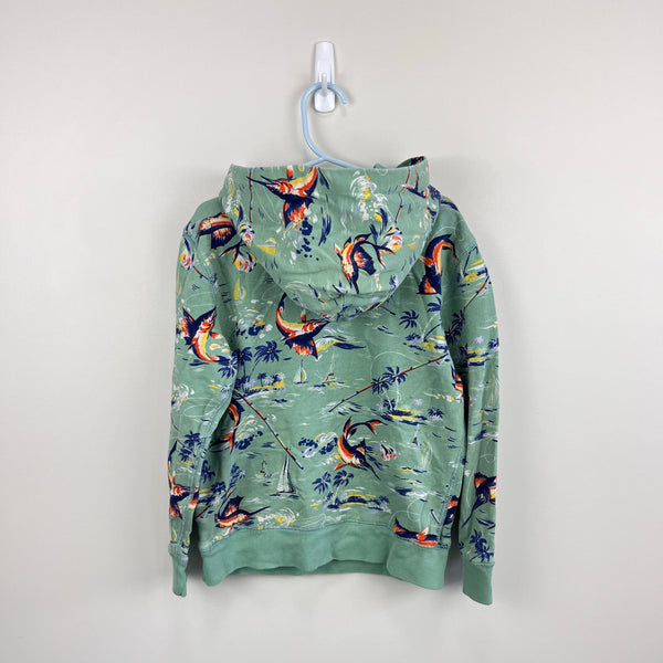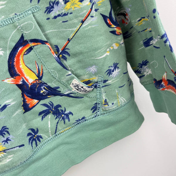 Polo Ralph Lauren Boys French Terry Hoodie Green Marlin. Boys size 7. Cozy hooded pullover sweatshirt with kangaroo pocket. Fun nautical fishing theme print with swordfish, palm trees, and boats. 100% cotton. Great condition with no flaws noted.