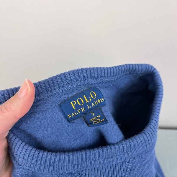 Polo Ralph Lauren Boys Logo Fleece Sweatshirt Blue. Boy (or girl) size 7. Super cozy, preppy crewneck pullover sweatshirt. Blue with cream POLO logo on the chest. Great condition with no flaws noted!