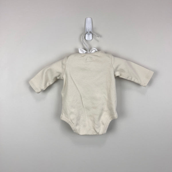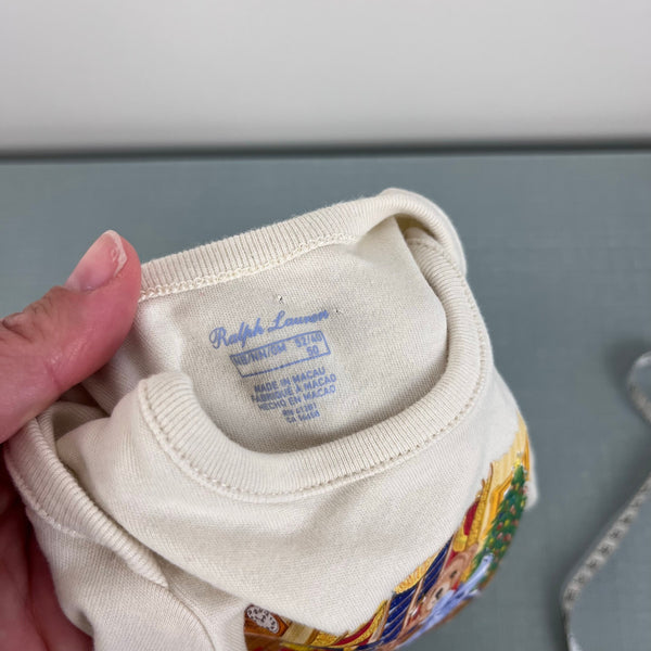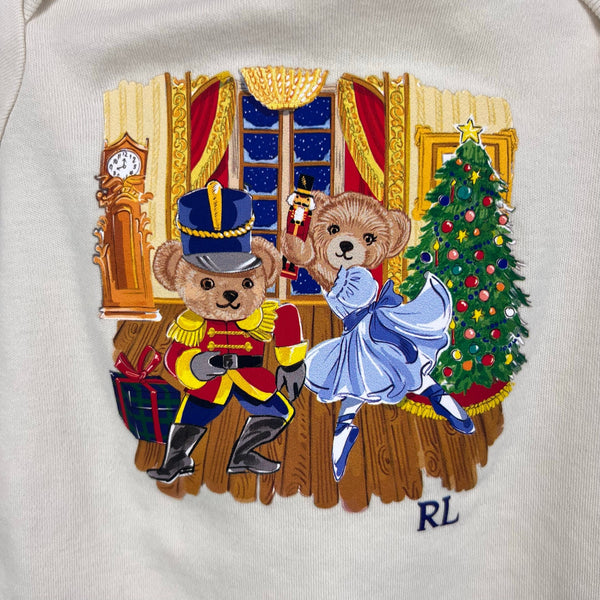 Ralph Lauren Christmas Nutcracker Ballet Bear Bodysuit. Baby boy or girl size newborn. Long sleeve cream onesie featuring the icon polo teddy bears dancing the Nutcracker. Pin holes by the tag (see photo), but otherwise excellent, like new condition.