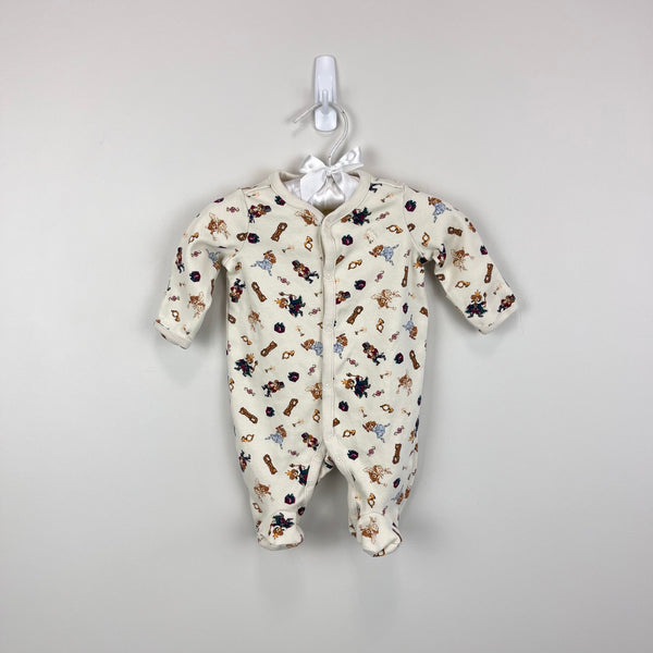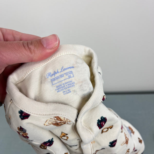 Ralph Lauren Christmas Nutcracker Ballet Bear Cotton Jersey Footed Coverall. Baby boy or girl size newborn. Long sleeve cream sleep and play outfit with fun print featuring the iconic Polo teddy bears dancing the Nutcracker. Pin holes by the tag (see photo), but otherwise excellent, like new condition. Snaps all the way down the front for easy on/off.