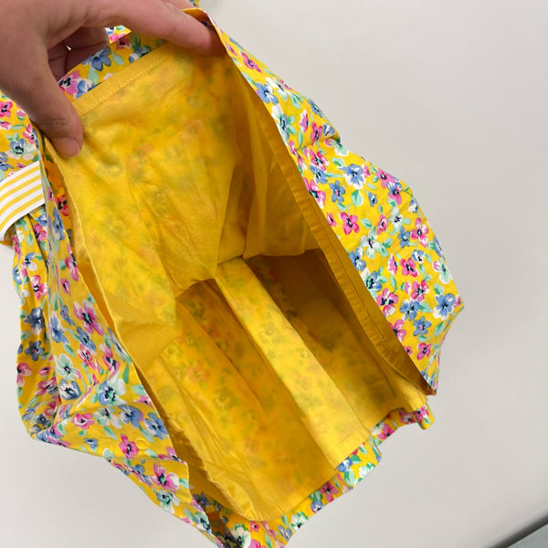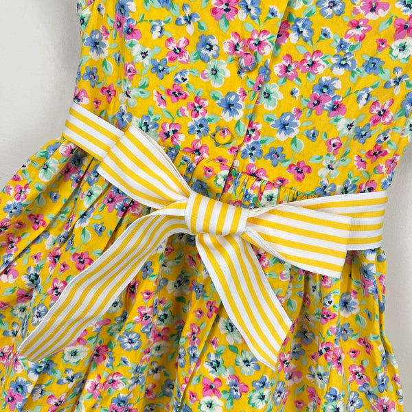 Ralph Lauren Girls Yellow Floral Dress. Baby toddler girl size 18 months. Short sleeve top and nice full skirt bottom. Buttons in the back. Preppy yellow with blue and pink flower print. Striped sash to tie a bow in the back. Includes matching diaper cover. Light mark on sash (see photo; untreated), but otherwise excellent condition. Perfect for a party or other special occasion!