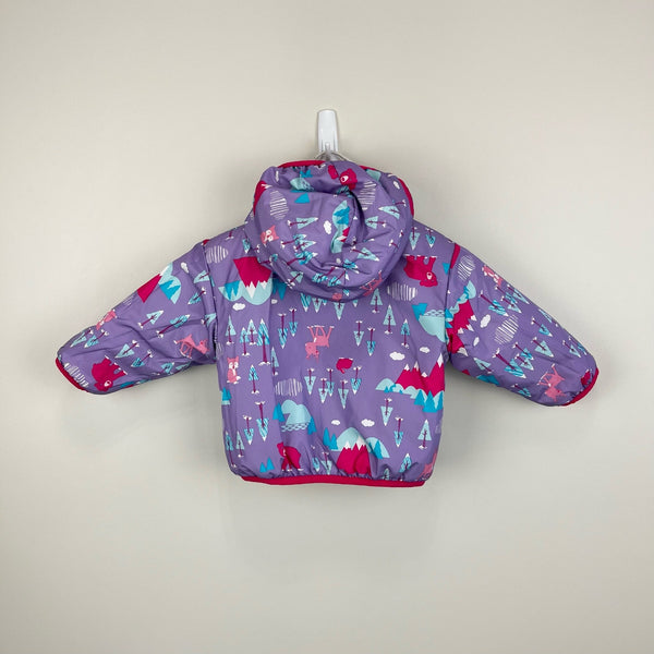 The North Face Girls Reversible Perrito Jacket. Baby girl size 3-6 months. Adorable insulated winter coat. Fully reversible with tag hidden in zippered chest pocket. Quilted bright pink on one side, and printed purple woodland mountain design on the other. Features lightweight but warm insulation, elastic binding on hood, cuffs and hem, chin zip guard, embroidered logos on front and back, and water repellent finish. Excellent condition.