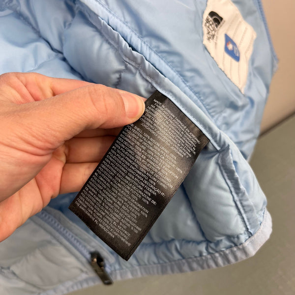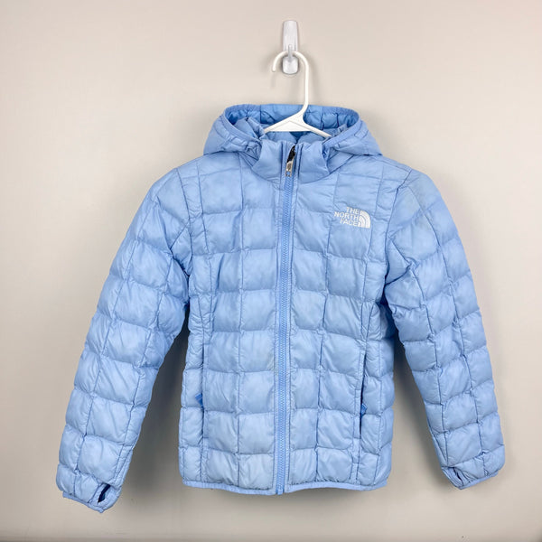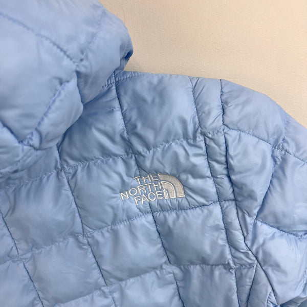 The North Face ThermoBall Hooded Jacket Light Cornflower Blue. Girls size medium (10 years). Lightweight, insulated winter coat. ThermoBall synthetic insulation provides warmth even when wet. Packable; warmth without bulk. Thumbholes improve coverage and help seal in heat. Removable hood. Logo on the chest and back. Great condition with a couple very faint marks (see photos; untreated). Original retail approx. $140.