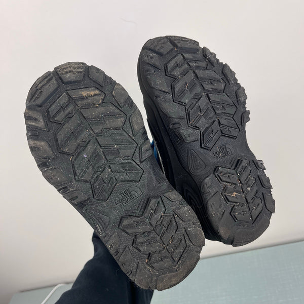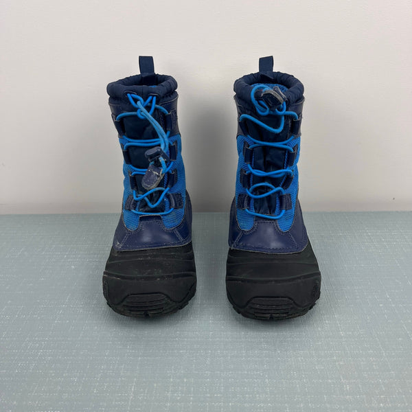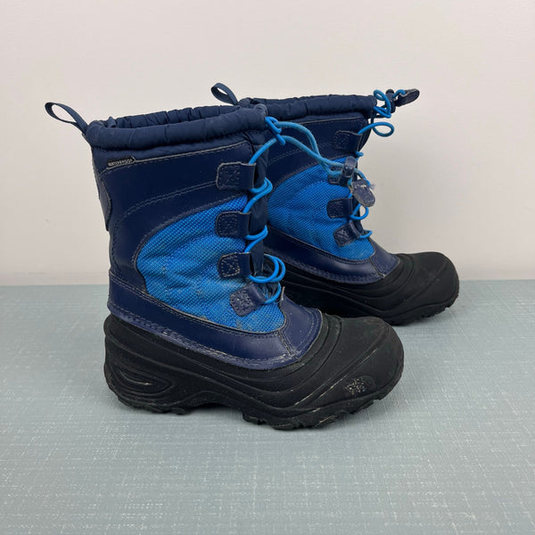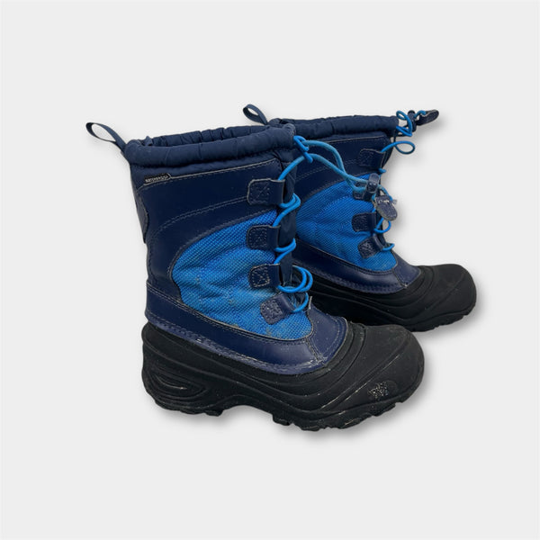 The North Face Kids’ Alpenglow Waterproof Boot. Youth boy or girl shoe size 1. Insulated blue and navy snow boots with warm, removable liner, durable rubber outsole, and a bungee lace shaft. Blue and black. Light marks/wear. See photos for more details.