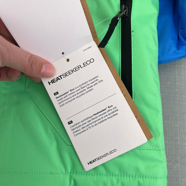 Features: Durable water-repellent (non-PFC DWR) finish 200 g Heatseeker™ Eco insulation in body, 150 g in sleeves, and 100 g in hood for warmth even in wet weather Waterproof, breathable, seam-sealed DryVent™ 2L shell Attached, three-piece hood with an elasticated rain-guard tunnel for a snug fit Reverse-coil center front zip with an internal draft flap and chin zip guard Shaped sleeves with adjustable hook-and-loop cuff tabs Hand pockets with water-resistant, exposed, reverse-coil zips Secure-zip pass pocket on left sleeve Powder skirt Drop-tail hem ID label Heat transfer logo on left chest and back-right shoulder