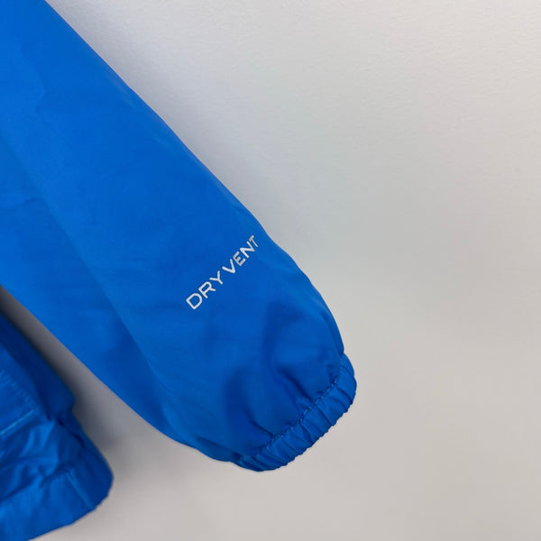 The North Face Tailout Dryvent Rain Jacket Blue. Toddler boy or girl size 4T. Full zip rain coat with fixed hood. Waterproof, breathable, and fully seam sealed. Bright blue with navy.
