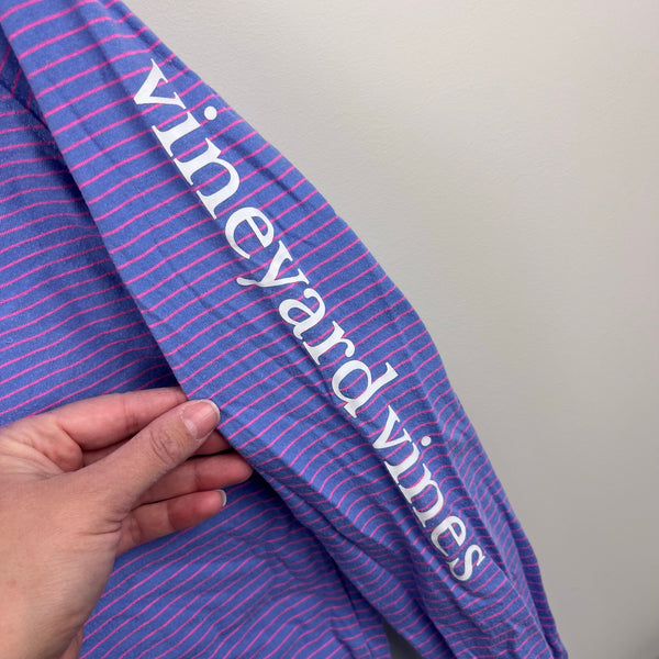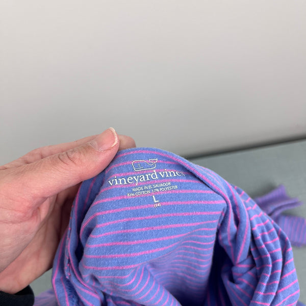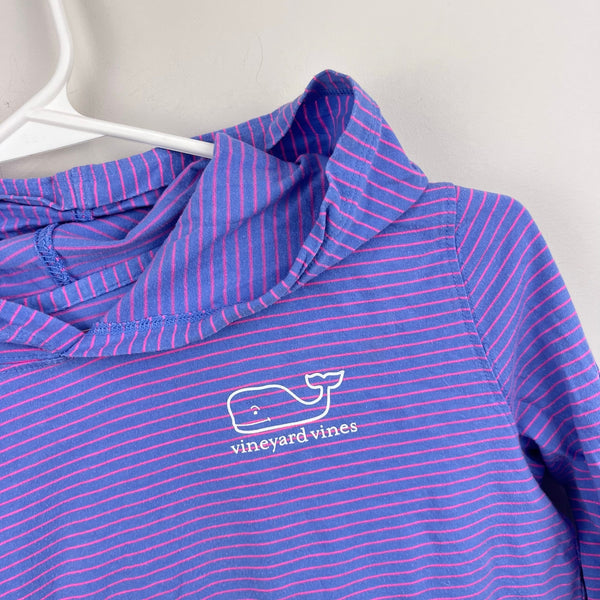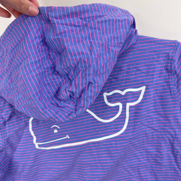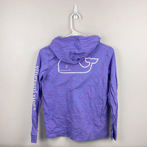 Vineyard Vines Long Sleeve Hoodie Whale Pocket Tee Shirt. Girls size large (14 years). Casual long sleeve hooded top. Purple with pink stripes. Whale logos on the chest and on the back, with Vineyard Vines down the sleeve as well. Great condition with light wear; no stains, tears, etc.