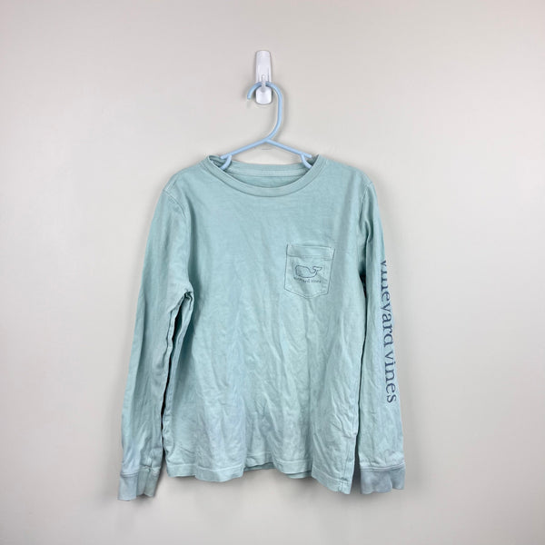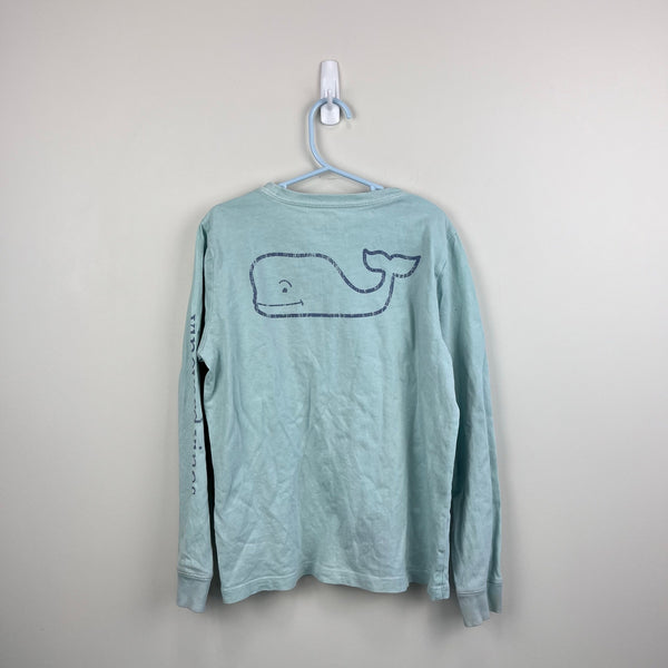 Vineyard Vines Boys' Long-Sleeve Vintage Whale Garment-Dyed Pocket Tee Shirt Aqua Sky. Boys size 7 years. Long sleeve blue top with signature whale logo on pocket and in back. Tiny hole at the pocket and faint marks at the hem (see photo; untreated). Perfect for school and the playground!