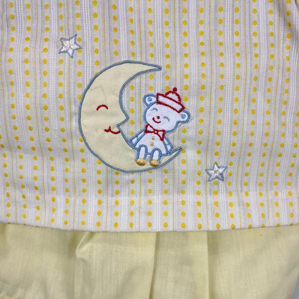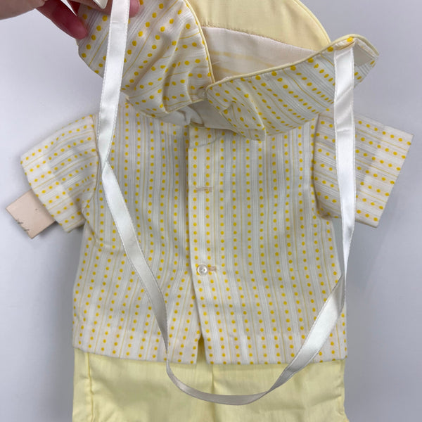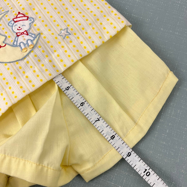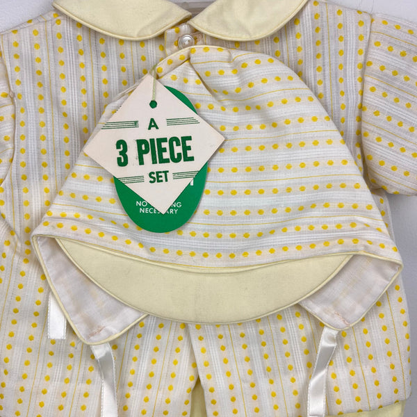 Vintage A Tiny Tots Originals 3 Piece Yellow Layette Shirt, Shorts, & Hat Set. Dead stock, brand new with tags (NWT). Baby boy or girl size layette; eyeballing it I'd guess up to 6 months, but please check measurements to ensure fit. Three piece outfit includes short sleeve collared top, bonnet, and pull on shorts with elasticized waist. Circa 1960s or 70s. Button back and moon and bear embroidery on the front of the shirt. Elastic in shorts is still good!