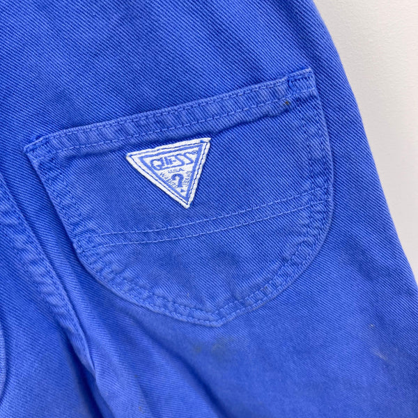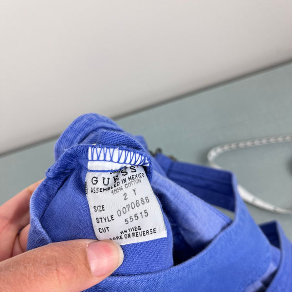 Vintage Guess Purple Denim Shortalls. Toddler girl size 2T. Eyeballing, these look to run big, but please see photo for length measurement (with straps at their loosest; tons of room to tighten). Gorgeous, unique periwinkle purple shorts overalls. Signature triangle patch on the back pocket. A couple light marks on the back (see photos; untreated).