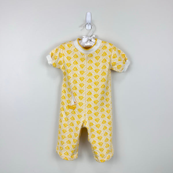 Vintage Health-tex Yellow Sailboat Coverall Romper. Baby toddler boy or girl size 18 months. USA made. Adorable one piece jumpsuit outfit. Long sleeve pants bottom and short sleeve top. All over sailboat design with an embroidered sailboat on the leg. Snaps on the shoulder and along the legs. Classic 70s style! Great condition with no flaws noted.