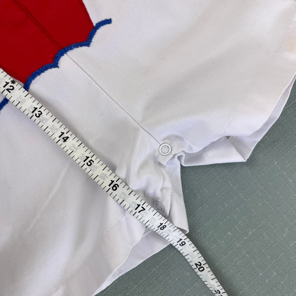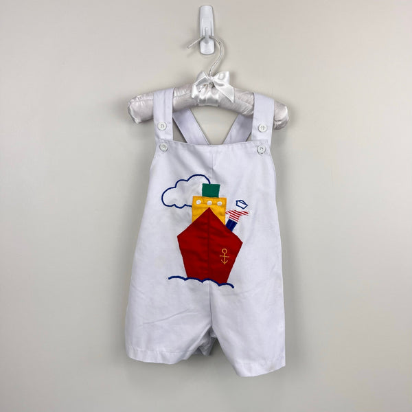 Vintage Hush Puppies White Applique Ship Shortall Romper. Baby toddler boy size 24 months. Shorts overalls with colorful applique boat and sailor on the front. Elasticized waist and button straps. Faint marks on the legs (see last photo; untreated). Perfect for summer!