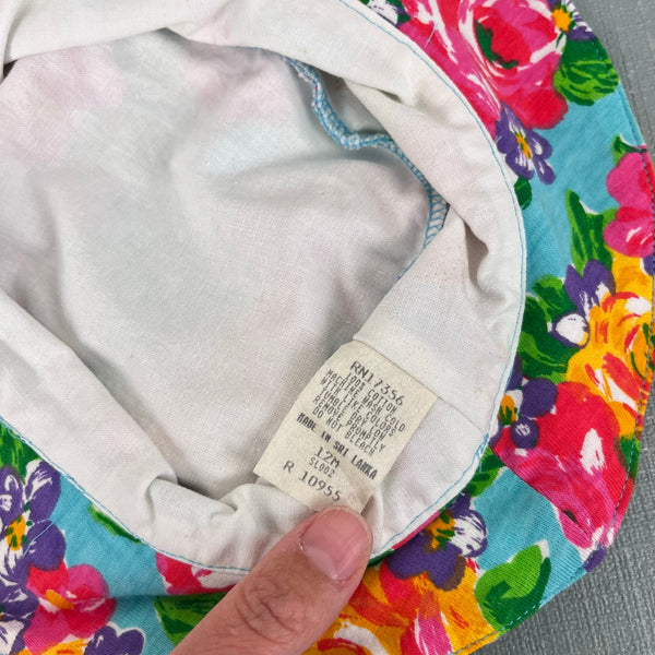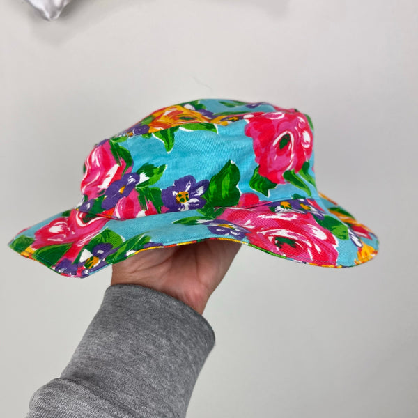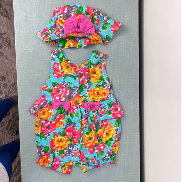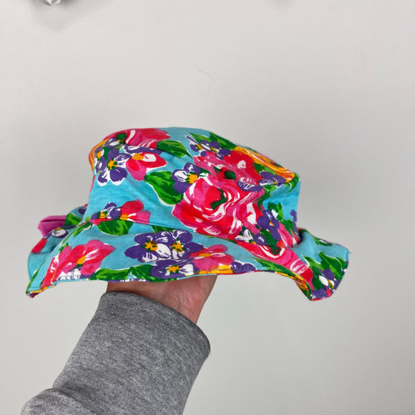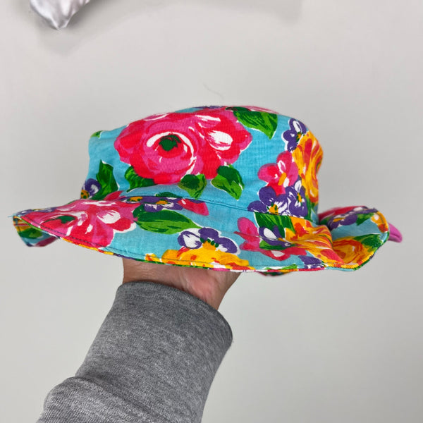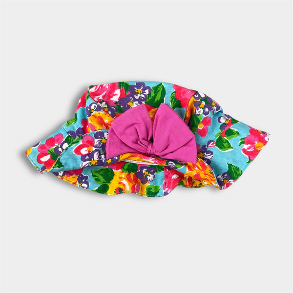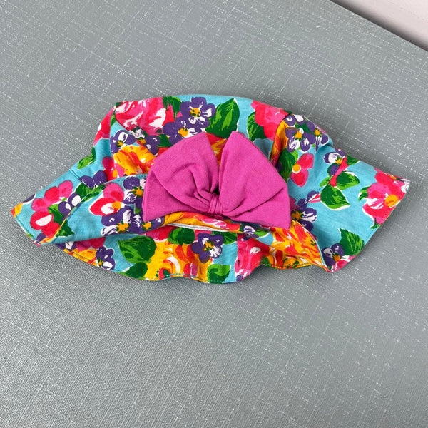 Vintage Jet Set Floral Bow Bucket Hat. Baby girl size 12 months. Adorable floppy 90s sun hat in colorful blue flower print with pink bow on the front. Matching romper available separately.