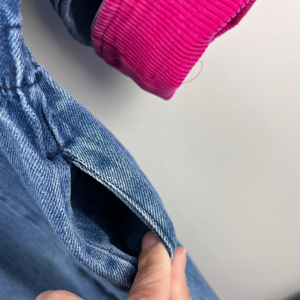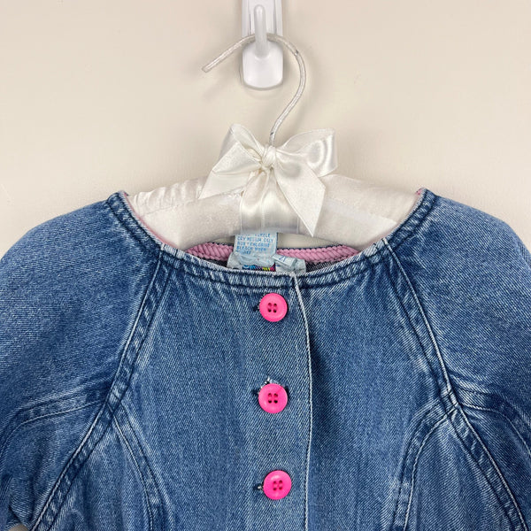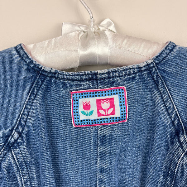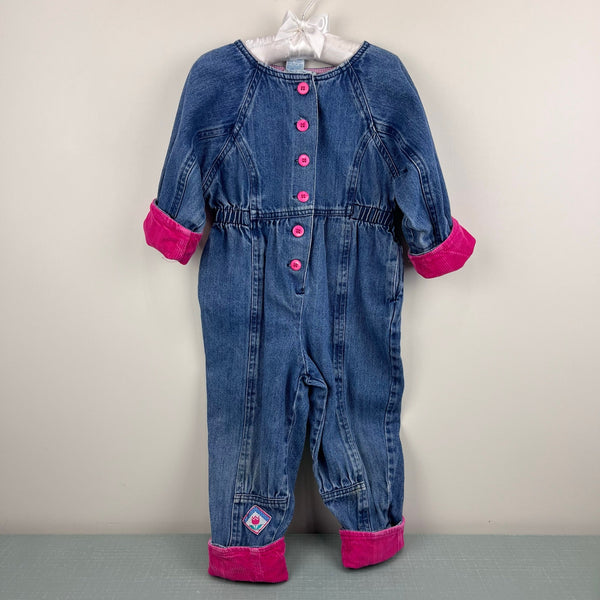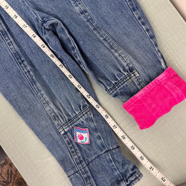 Vintage 90s Kids Classics Denim Tulip Jumpsuit Romper. Toddler girl size 2T. One piece blue jean coverall outfit. Features button placket, flower patches on the leg and back, and fold over pink corduroy cuffs for an adjustable fit. Elastic in the back is worn out. Has pockets! See photos for measurements.