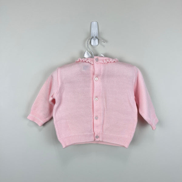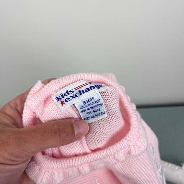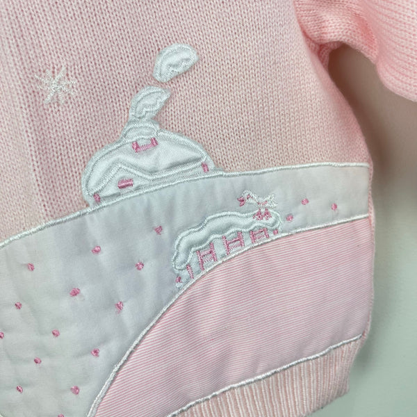 Vintage Kids Exchange Pink Ruffle Snow Day Sweater. Baby girl size 6 months. Adorable button back sweater with ruffle collar and fabric patches and embroidery to create a cozy winter scene of a house, snowflakes, tree, and bird on a fence. Faint marks on the front (see last photo; untreated).
