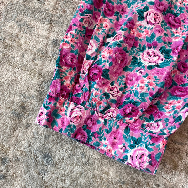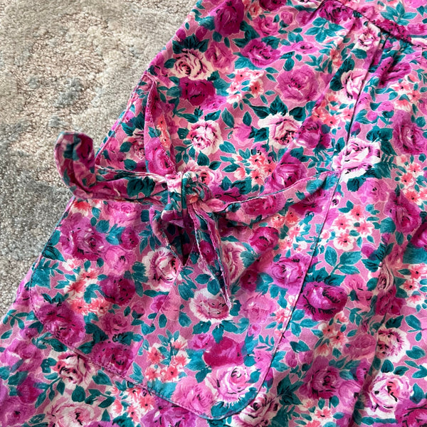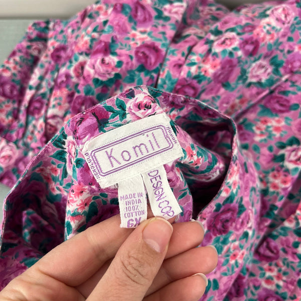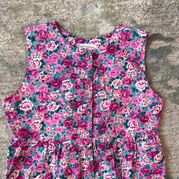 Vintage Komil Floral Jumpsuit Overalls. Girls size 6. Sleeveless one piece romper outfit in gorgeous pink flower print. Features button front and pockets with ties. Classic 90s style!