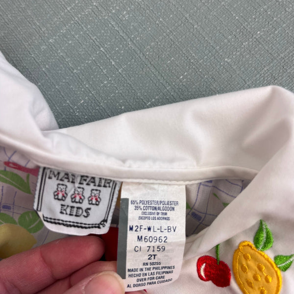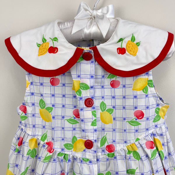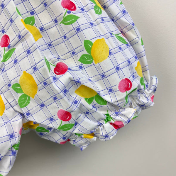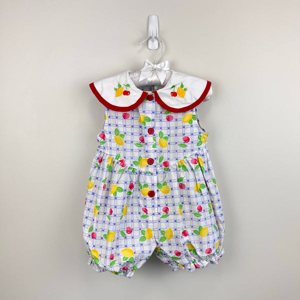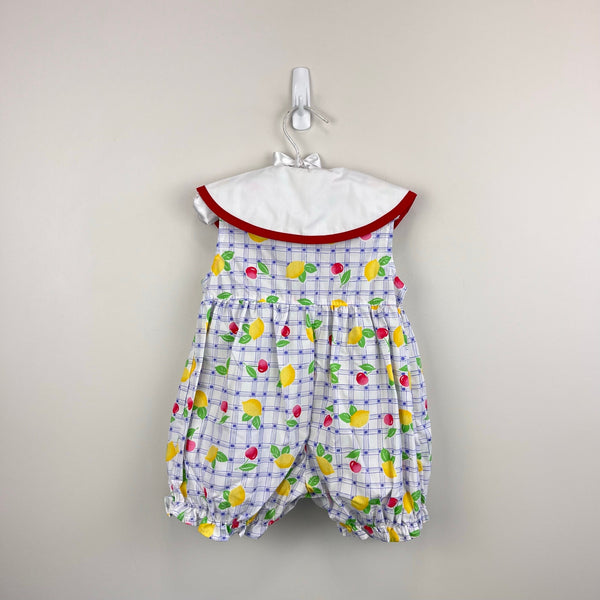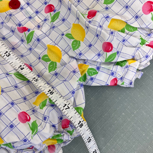 Vintage 90s Mayfair Kids Fruit Bubble Romper. Toddler girl size 2T. One piece sleeveless shortall outfit. White blue windowpane plaid with lemons and cherries. Round collar. Button front and snaps at the bottom. Elasticized cuffs. So cute for summer!