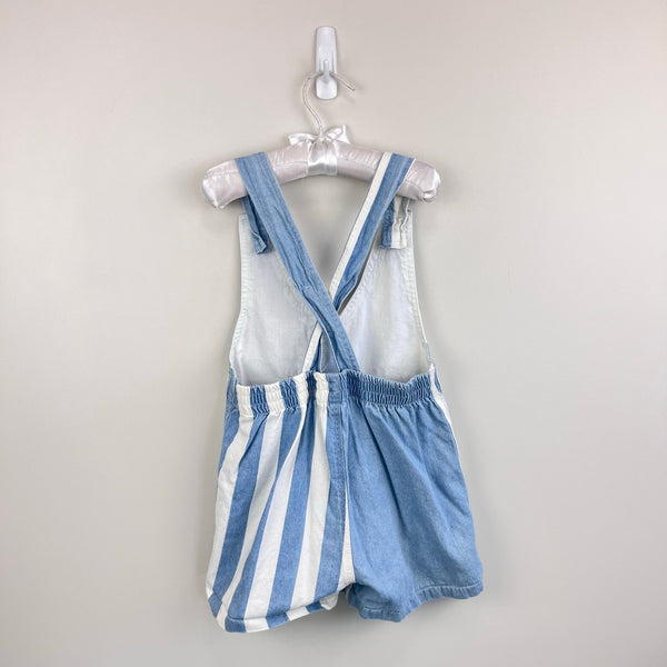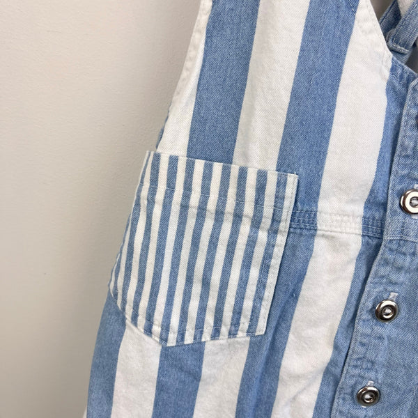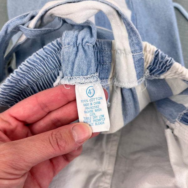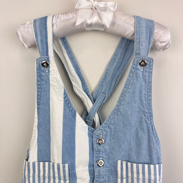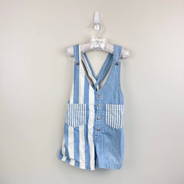 Vintage 90s Mixed Blue Stripe Shortall Romper. Toddler boy or girl size 4T. No brand, but this reminds me so much of classic 90s Gap! Fun shorts overalls with unique v-neck button front and patch pockets. Half solid chambray blue and half bold stripes. Elastic in the back of the waist adn snaps at the bottom. Great condition with no flaws noted!