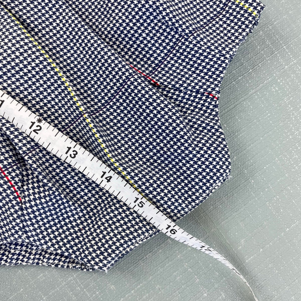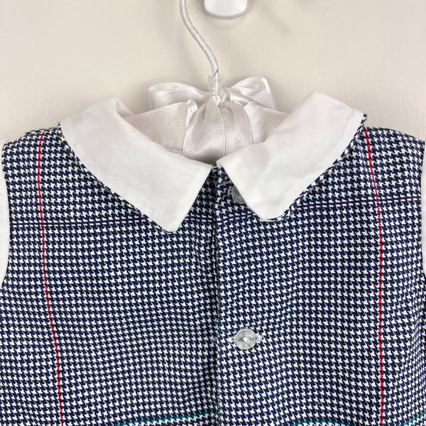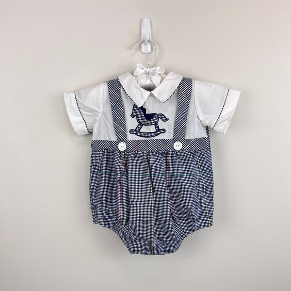 Vintage Nannette Rockinghorse Shortall Romper. Baby boy size 3-6 months. One piece bubble outfit designed to look like two pieces - suspender shorts and short sleeve collared top. Navy blue and white houndstooth plaid with red and yellow. Fun rocking horse design on the chest. Button in the back and snaps at the bottom.