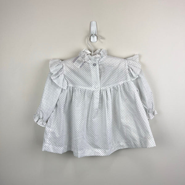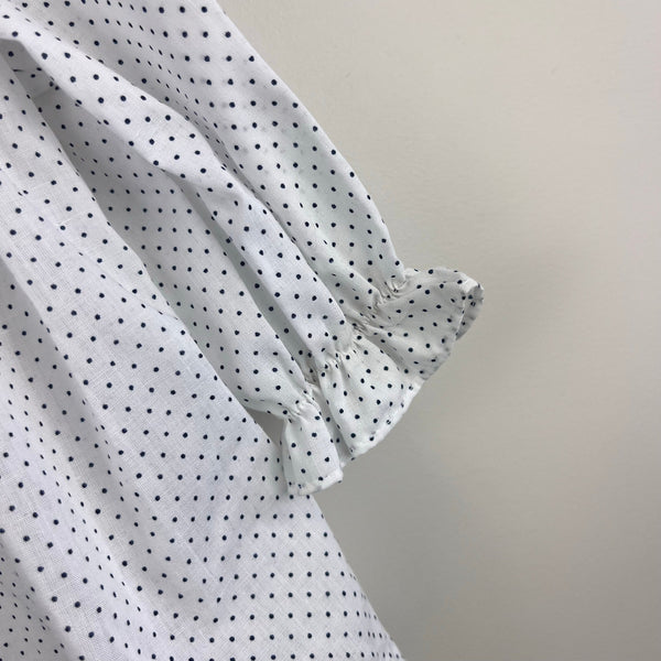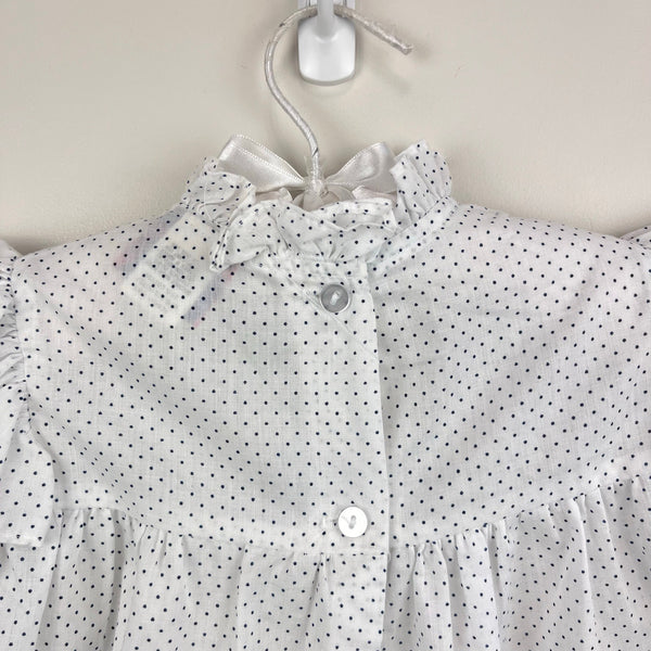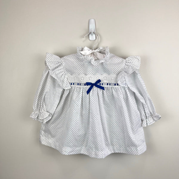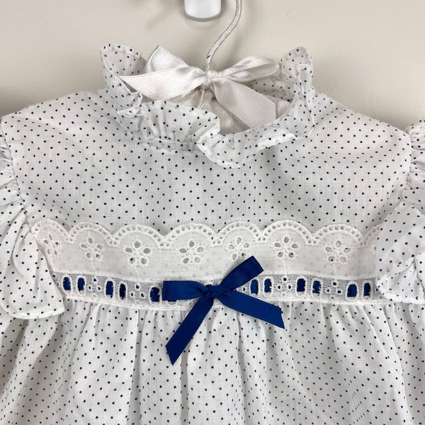 Vintage New York Kids White Navy Polka Dot Lace Bow Dress. Toddler girl size 3T. USA made. Long sleeve white dress with navy blue dots. Features ruffles at the shoulders and neck, white eyelet lace and blue ribbon bow at the chest, elasticized sleeve cuffs, and buttons in the back. Great condition with no flaws noted! Perfect for a party!