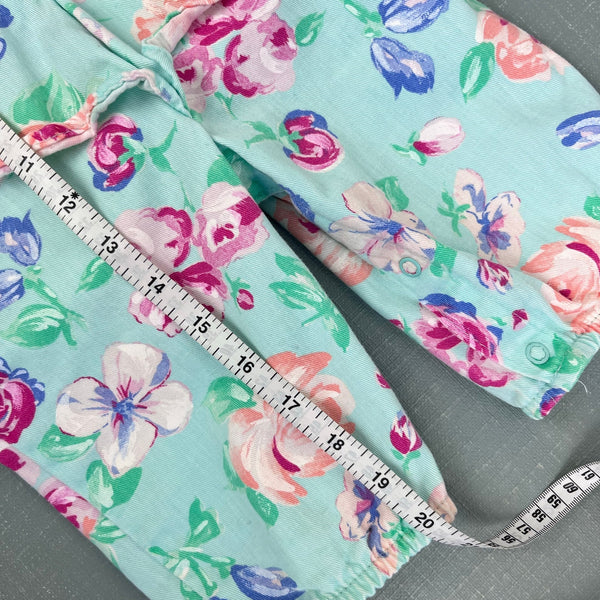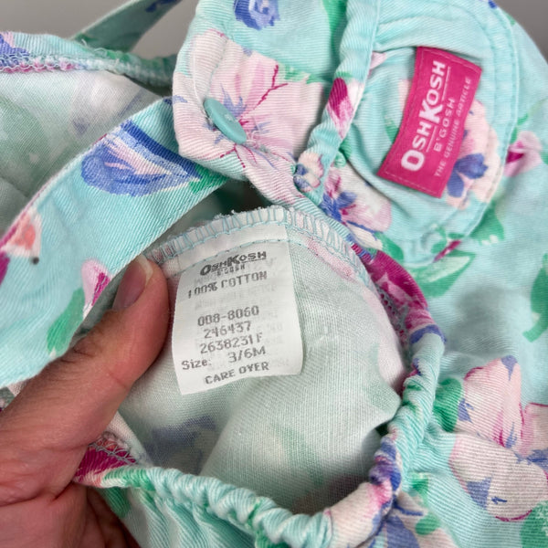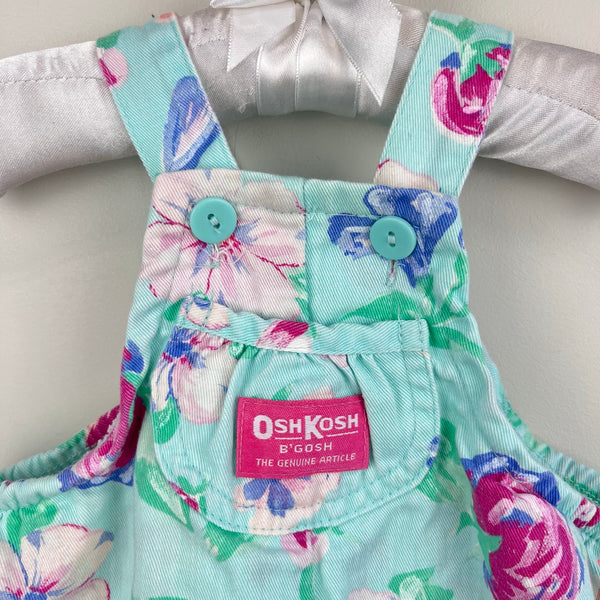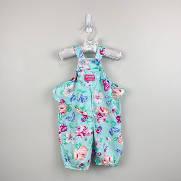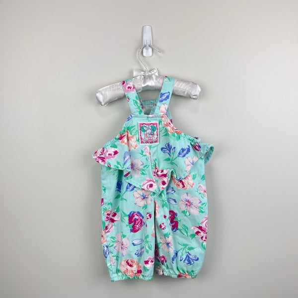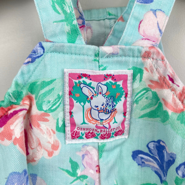 Vintage OshKosh B'gosh Green Floral Ballet Co Bunny Ruffle Overalls. Baby girl size 3-6 months. USA made. Gorgeous mint green overalls with peach, pink, and blue flowers. Pink tag on the bib pocket and fun bunny rabbit patch on the back - perfect for Easter and all spring long! Fun ruffles at the waist. Button straps and snaps along the legs. Elastics are worn out but no other flaws noted.