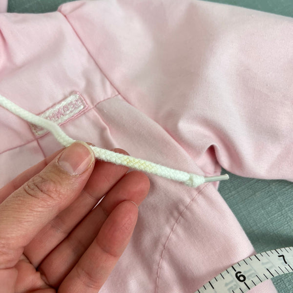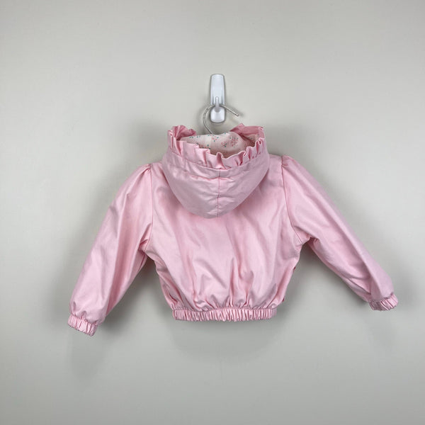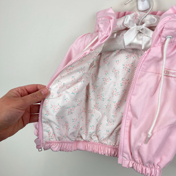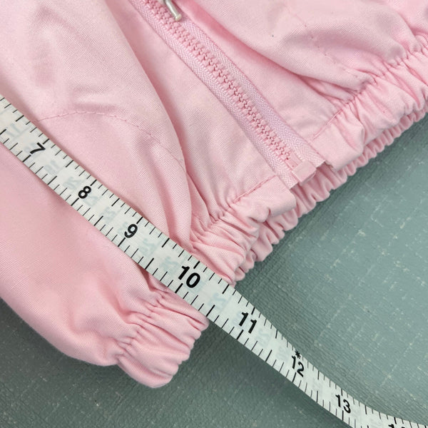 Vintage OshKosh B'gosh Pink Hooded Windbreaker. Baby girl size 12 months. Union made in the USA It doesn't get any cuter than this! Casual zip up jacket with ruffle lined fixed hood, elasticized waist and cuffs, and soft floral lining. Even has pockets! Faint mark on drawstring (untreated; see last photo), but otherwise great condition! So sweet for spring!