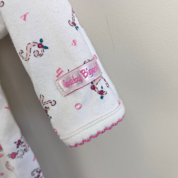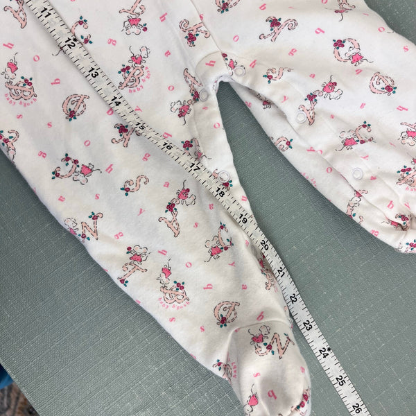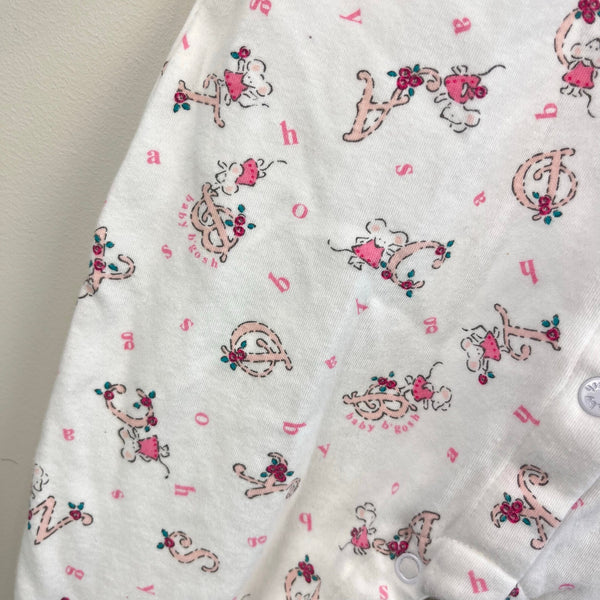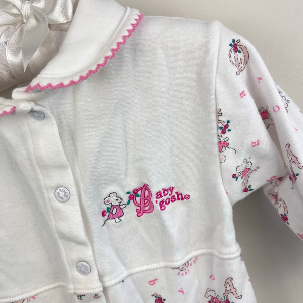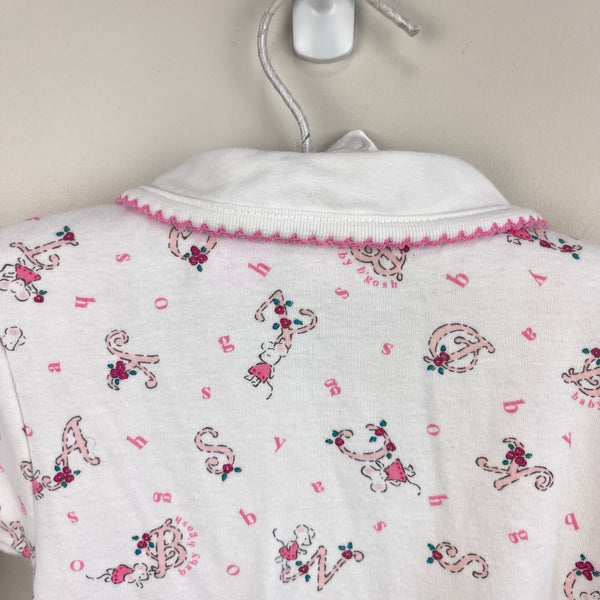 Vintage 90s Y2K OshKosh B'gosh Pink White Alphabet Mouse Footie Coverall. Baby girl size 6-9 months. Cute and cozy one piece sleep and play outfit. Center snap placket and snaps along the legs for easy on/off. Picot trim on the collar and cuffs. Fun print features mice, flowers, and letters.