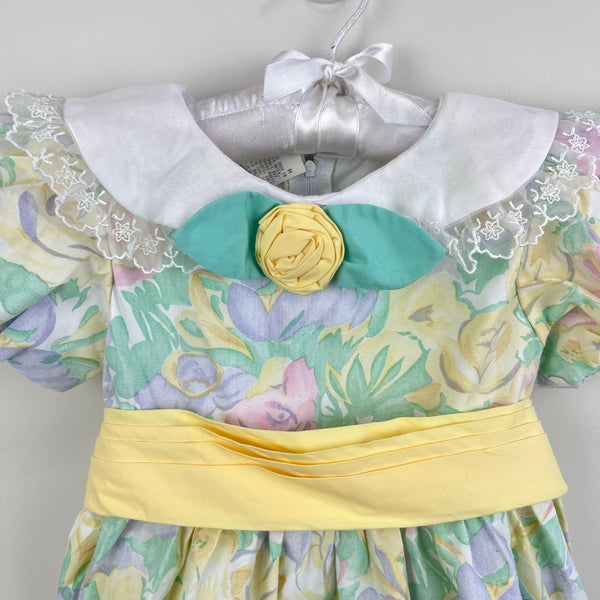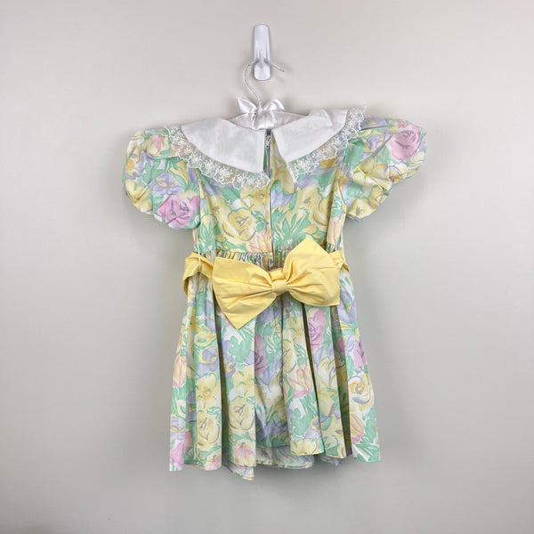 Vintage 80s 90s Pastel Floral Party Dress. Toddler girl size 4T. Short sleeve dress with lace lined white collar, rosette, and yellow sash belt with a fixed bow in the back. Zip closure. Gorgeous yellow, green, pink, and purple flower print. Looks like the hem has been let down. (See photo for STH measurement.) Perfect for Easter or a spring party!