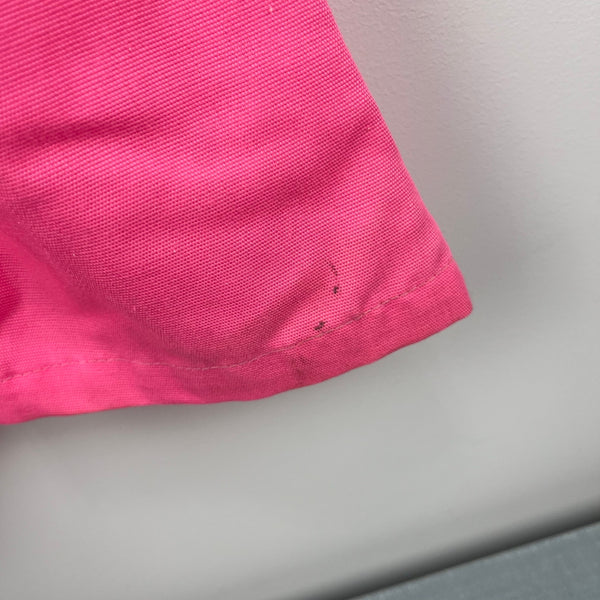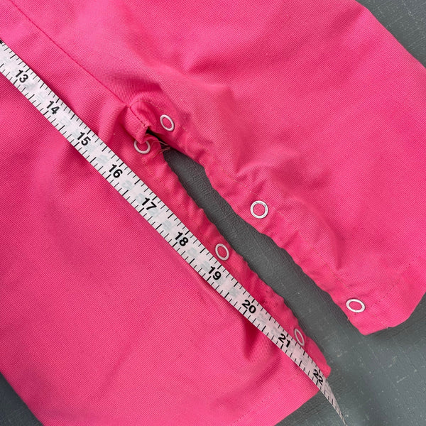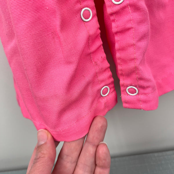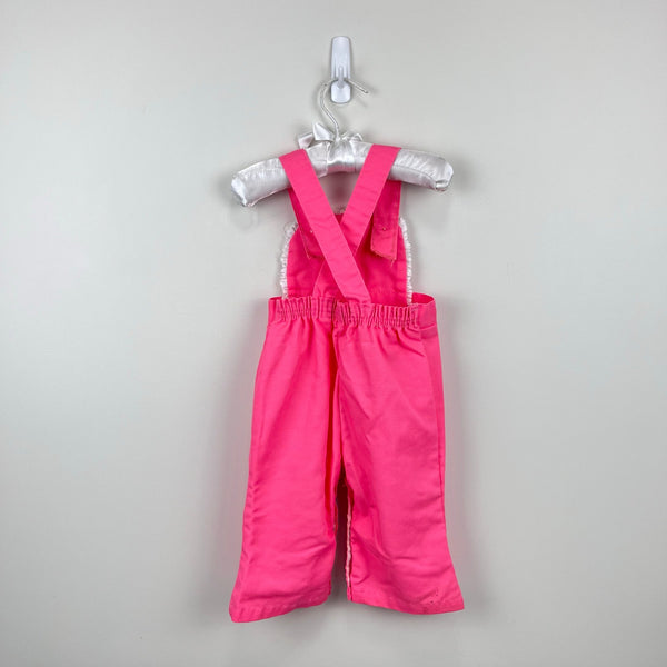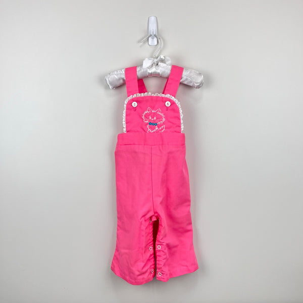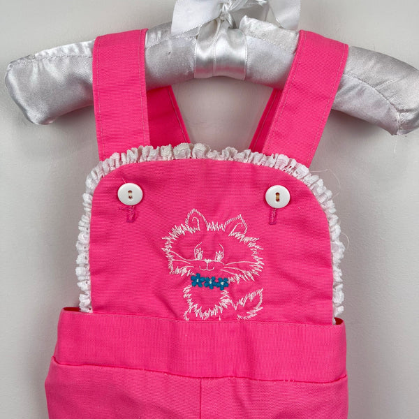 Vintage Pink Cat Lace Ruffle Overalls. Baby girl size 12 months. USA made. No brand tag, but looks like it could be 60s/70s Healthtex, Carter's, or JC Penney. Bright pink overalls with button straps, snaps along the legs, and elastic waist. Embroidered fluffy kitten wearing a blue flower collar on the lace lined bib. Light marks at the hem (see photos; untreated) but otherwise great condition. Perfect for spring!