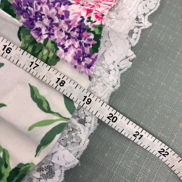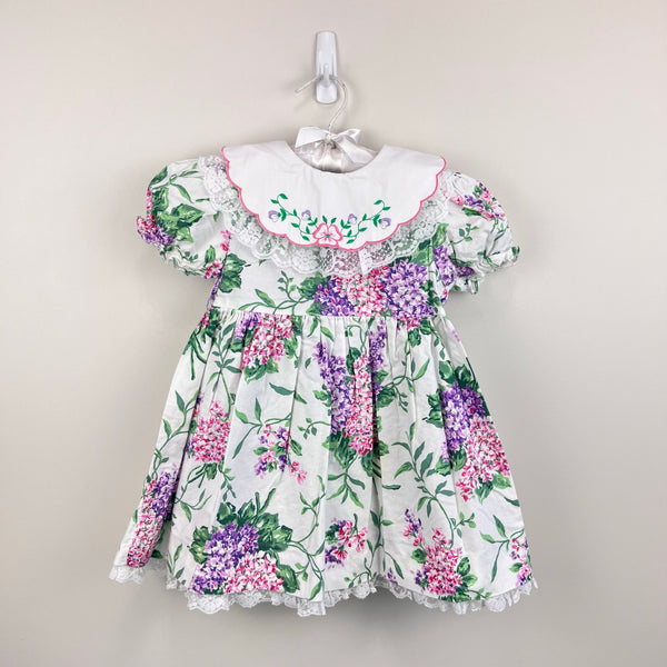 Vintage Pink Purple Floral Lace Collar Party Dress. Toddler girl size 4T. No brand tag. Gorgeous short, puff sleeve dress. Short, puff sleeve dress with scalloped bib collar and lace ruffle hem. White with gorgeous pink, purple, and green flower print. Great condition with no flaws noted. Perfect for Easter or a spring party!