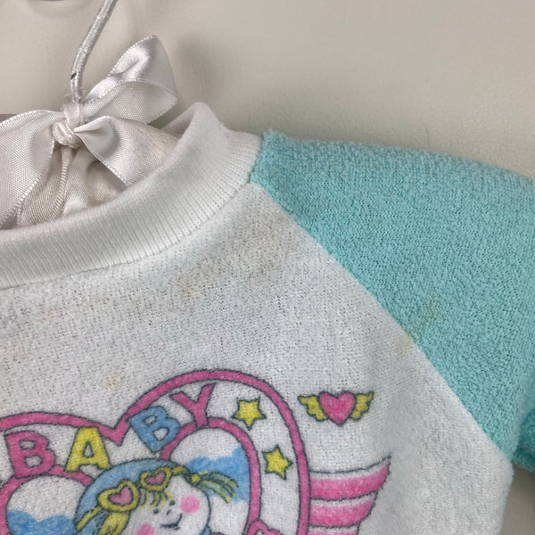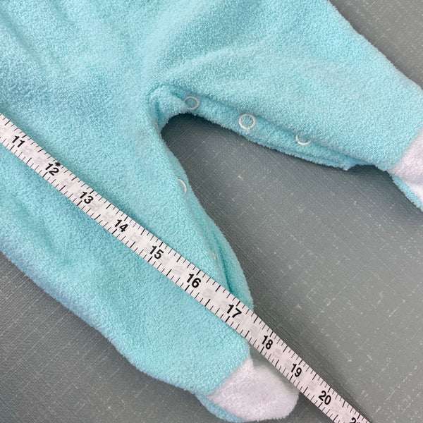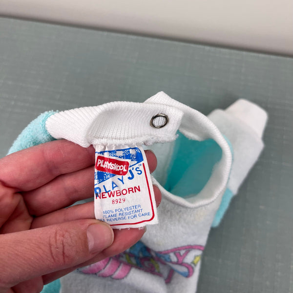 Vintage Playskool Play J's Baby Flight Club Footie Coverall. Baby girl size newborn. Cozy one piece footed terry outfit designed to look like a two piece top and bottom set. White and aqua green with pastel pink, yellow, and blue. Features an airplane pilot in a heart on the chest. Snaps in the back and along the legs. Faint marks at the chest (see close up photo; untreated).