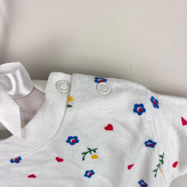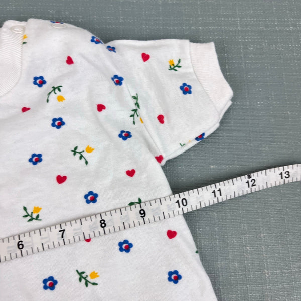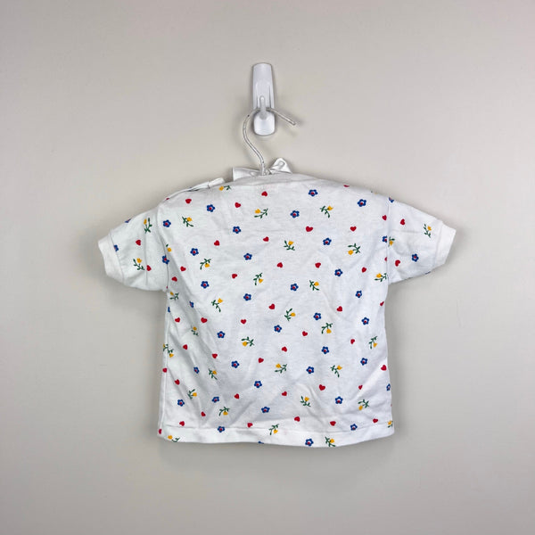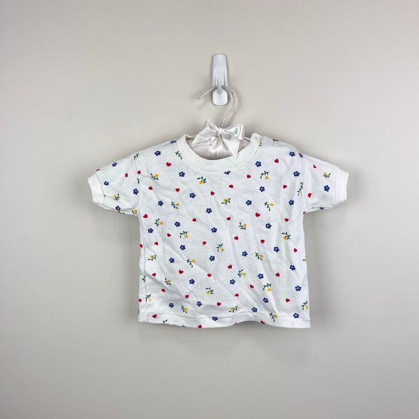 Vintage 80s 90s Short Sleeve White Floral Heart Tee Shirt. Baby toddler girl size 18 months. Short sleeve top with colorful blue and yellow flowers, and red hearts, too. Snaps on the shoulder for easy on/off. So cute paired with overalls or colorful shorts!