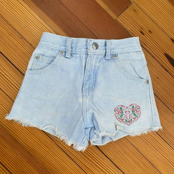 Vintage Sonoma Jean Company Light Wash Cut Off Jean. Shorts. Toddler girl size 4. High waist, light wash denim shorts. Elastic waist and floral heart patch on leg. Some light marks on back (untreated; see photo). See photos for measurements.
